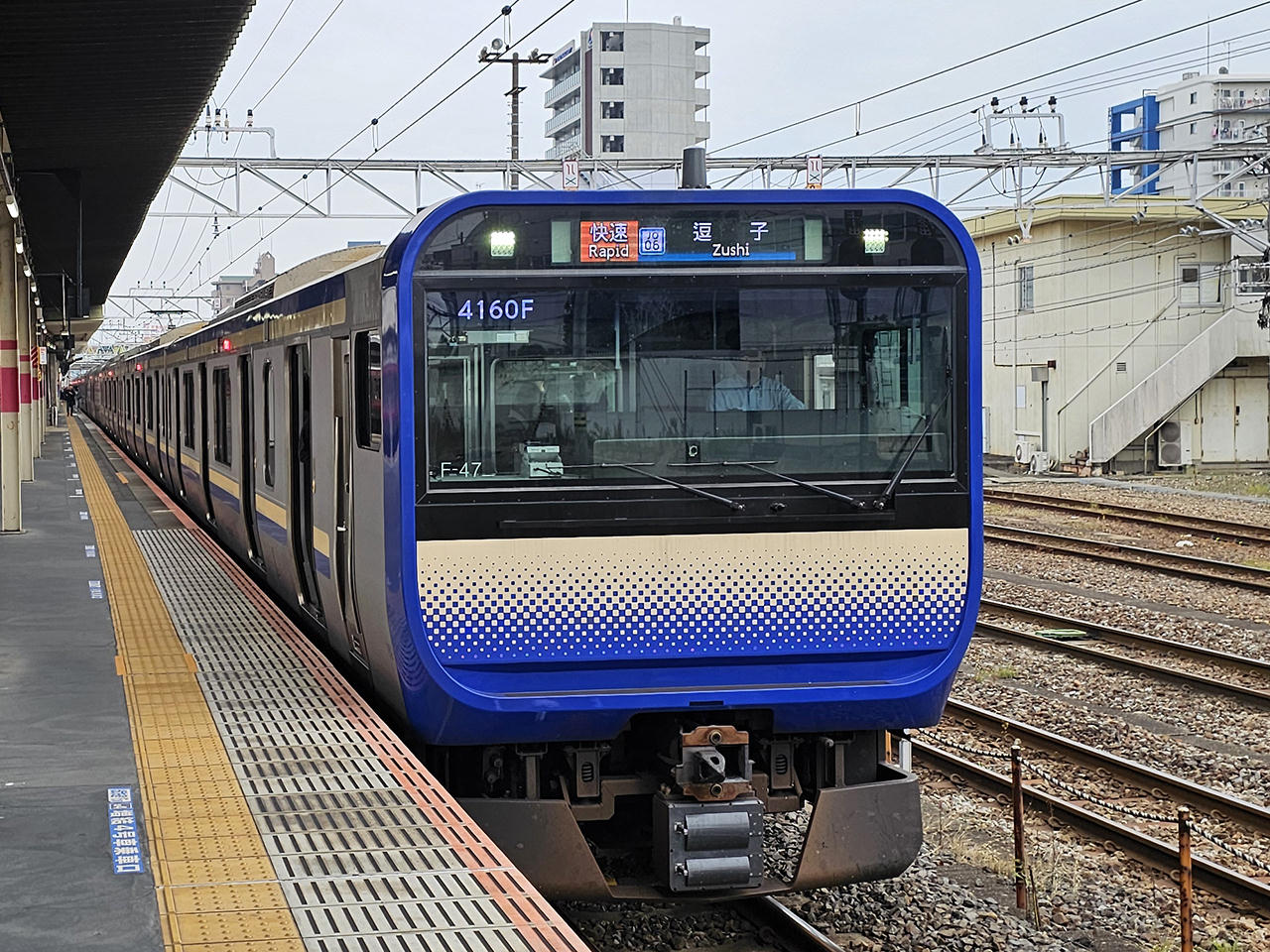 | J-03編成。2020/10に製造された。2021/1/24撮影。基本編成はF-04と合っていなかった。2020/12/27に01(2)運用で営業運転開始。増1号車電連付。 (千葉) ★ 稲毛にて。[快速|久里浜]。こちら ★ 稲毛にて。[快速|東京]。こちら |