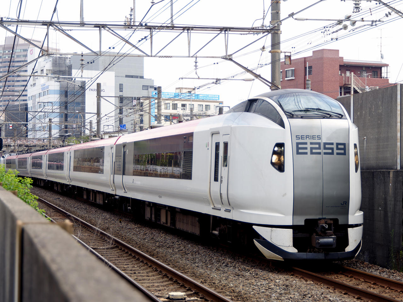 ★ 2024年3月から「しおさい」に充当され、銚子に乗り入れることになったE259系。塗装変更がなされ、前面のN'EXが消えた。 (西千葉) ★ 西千葉にて。こちら |