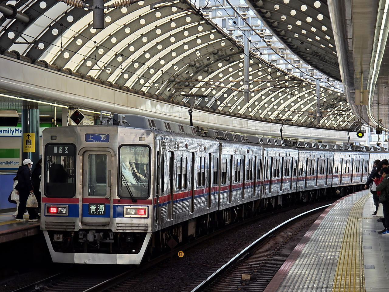 | 3500形は京成初のステンレス電車となり、4連24本の96両が製造されました。 その後の編成長大化に伴い、2編成を連結して8連で運用されたり、編成を2両ずつ分割したものを4連に繋いで6連で運用されたりしています。また過去には緊急措置として、2+4+2という編成が運転されたこともありました(これは組成されても大抵は2〜3日で解除された)。 4・6・8連と自由に組成できるために、他形式車の入場や故障などが発生すると、必要に応じて組成変更が頻繁に行われています。 全96両中、3504F〜3556Fの56両が更新されて、顔つきがかなり変わりました。前面形状の変更、車体一部張り替え、スカートの取り付け、側窓の交換、ドア間の変更、車外放送用スピーカーの取り付け、先頭車の台車の振替、引き通し線の変更、ドアエンジンの交換等大規模な改造になりました。後期の更新車では、シングルアームパンタに交換されました(後に全編成交換)。更新車は更新車同士で8連・6連・4連を組み、羽田空港乗り入れを含む特急から普通まで幅広く運用されています。都営浅草線西馬込や京急線羽田空港まで顔を出すこともあります。2008年に入り、全車がシングルアームパンタに交換されました。また2010年に入って種別幕が新型のものに交換されています。 一時期4連単独での運用が全くなく、全て6・8連で運用されていましたが、2013年より3300形4編成の廃車に伴って3026F, 3027Fが増備されたため、8連2本が解除されて全体的な組成変更が行われ、4連が再び運転されています。その後2015年に入って8連がなくなり、6連と4連での運転となり、京成押上線や西馬込、羽田空港には運用されなくなりました。 しかし、更新はこの56両で中止されました。その影響を受けて、3560F、3564F、3568F、3580F、3584Fが廃車、3572Fが台車試験車となった後廃車となりました。 未更新車は全て4連で、普通列車に運用されていましたが、2017年に全車廃車となりました。 運用は2019年3月現在、以下のとおりとなっています。 ・8連 定期では組成されない。他形式車の入場や故障時に2+4+2の8連が緊急組成されることがあります。大抵は1日で運転を終了します。ここ数年は確認されていません。 ・6連 本線、千葉線、ちはら線で3000形、3688F、3700形と共通運用で運用されています。 ・4連 金町線の73、71運用に、4連2本が3668Fと共通で運用されています。月に数回不定期で車両交換があります。平日の本線81運用にも4連が使用されていますが、こちらは都合で6連、8連が充当されることもあります。 押上線、上野〜宗吾参道、千葉線・ちはら線の4連運用が全くなくなったため、金町線と平日本線81運用でしか4連が見られません。 ★の写真は、クリックすると別ウインドウが開き、大きな画像でご覧いただけます。 <過去の編成表> 2019年3月〜2021年8月前半 【8連】(更新車、シングルアームパンタ) 現在組成なし。 【6連】(更新車、シングルア-ムパンタ) <3504-3503-3502-3501>+3518-3517> <3508-3507-3506-3505>+3526-3525> <3520-3519+<3552-3551-3550-3549> <3528-3527+<3556-3555-3554-3553> <3544-3543-3542-3541>+3546-3545> <3548-3547+<3512-3511-3510-3509> 【4連】(更新車、シングルア-ムパンタ) 3516-3515-3514-3513 3524-3523-3522-3521 3536-3535-3534-3533 3540-3539-3538-3537(芝山鉄道) 検査等で時折数日間の組成変更はあり。 <最新の編成表> 2025年11月24日更新 【8連】(更新車、シングルアームパンタ) 現在組成なし。 【6連】(更新車、シングルア-ムパンタ)(赤字は室内蛍光灯) <3512-3511+3526-3525>+3510-3509>(3512, 3509にデジタル無線搭載) <3548-3547+3502-3501>+3546-3545>(3548, 3501, 3545にデジタル無線搭載) <3536-3535+<3504-3503+3534-3533>(3536, 3556, 3533にデジタル無線搭載) 【4連】(更新車、シングルア-ムパンタ) 両先頭車にデジタル無線搭載 3508-3507-3506-3505 3516-3515-3514-3513 3540-3539-3538-3537(芝山鉄道) 3544-3543-3542-3541 なお、2025/1/6〜1/9まで臨時組成変更があり、4連3本が以下の6連2本に組み替えられていました。この間、B51と81運用は6連が代走しました。 <3516-3515-3514-3513>+3506-3505> <3508-3507+<3544-3543-3542-3541> ここに来て激しい組成替えが短期間で実施されました。4連の中に2両を組み込む、通常なら緊急時にしかやらない編成の組み方になっています。 京成の公表資料によれば、3200形の増備は ・2024年度:6連1本(3205-3206+3201F) ・2025年度:6連2本(3212F+3207-3208、3217-3218+3216F) ・2026年度:24両 ・2027年度:54両 ※52両に減らされた となっており、2024年度の6両投入で3556-3555+<3552-3551+3554-3553の編成が廃車。今後3500形の廃車が進むと思われます。 3500形は2023年3月以後も走ることになり、デジタル無線取付が始まりました。2021/12に3512-11+26-25+10-09の3512, 3509にデジタル無線が取り付けられました。中間の3525には取り付けられませんでした。2023年度のデジタル無線完全使用開始後は先頭に出ることが出来ません。そこで早期廃車予定のユニットを中に閉じ込めてしまい、これらにはデジタル無線を取り付けず、コスト節約を図ったと思われます。 そして2022/7になんと、新形式3200形の登場が発表されました。4・6・8連が組めるということで