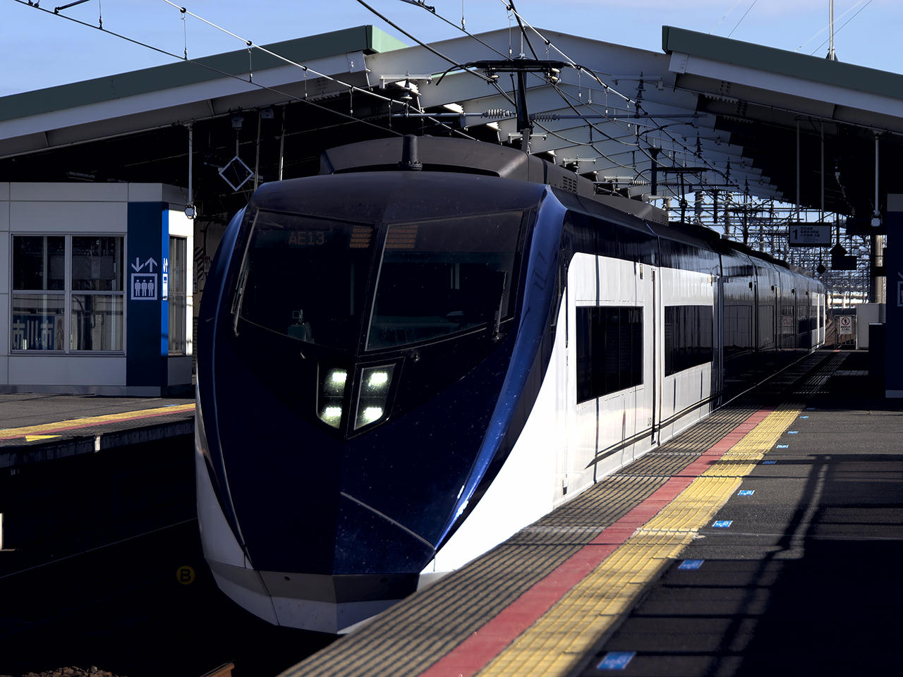 | ★ AE1-1。成田湯川駅を160km/hで通過する。急行灯点灯。 | ★ ブルーリボン賞受賞ステッカー付きAE1-1。急行灯点灯。 (高砂) |