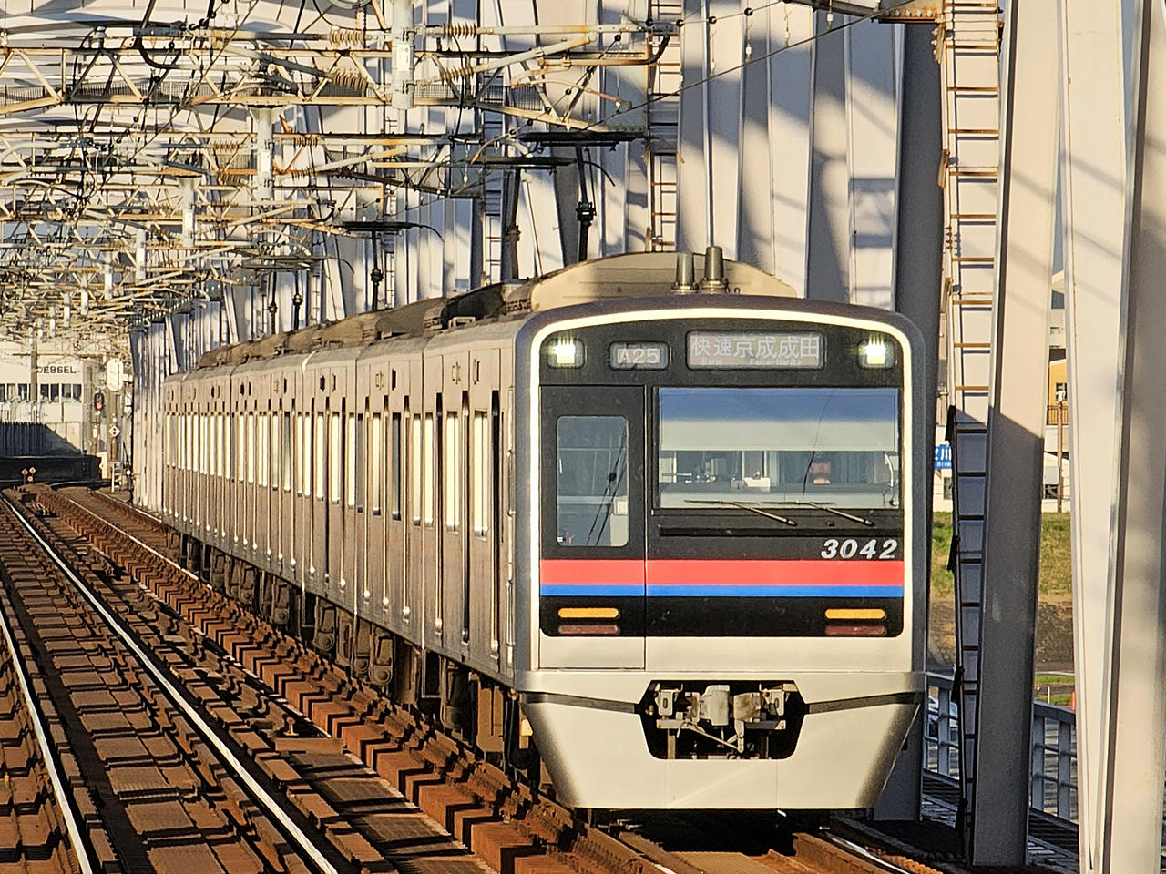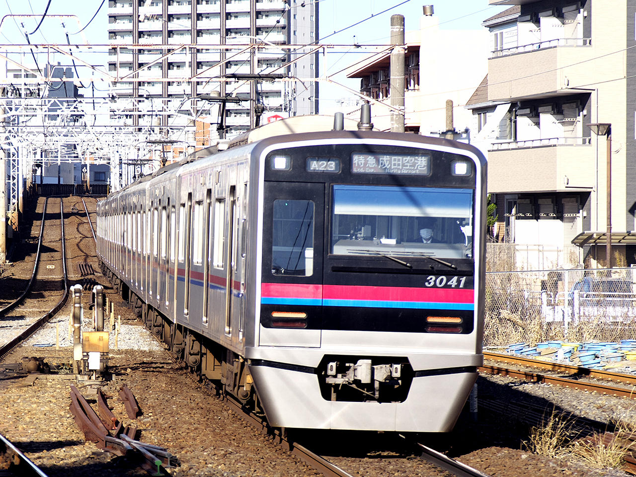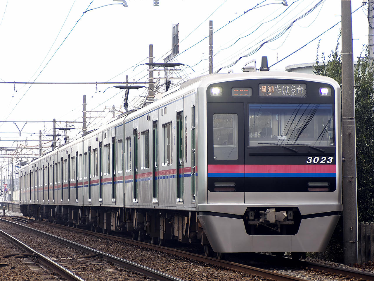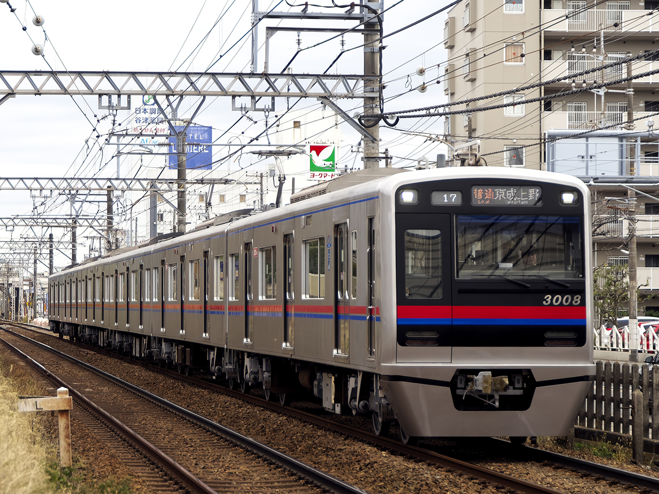 3001F3001-8。8連で、羽田空港・西馬込・上野〜成田空港・芝山千代田・印旛日本医大と広く運用される。写真は特急上野行。急行灯点灯。 (八千代台) ★ [特急|上野]。八千代台駅で夜3748と並ぶ。こちら ★ [特急|上野]@勝田台。その1 その2 ★ [快速|西馬込]。八千代台〜実籾にて。こちら |