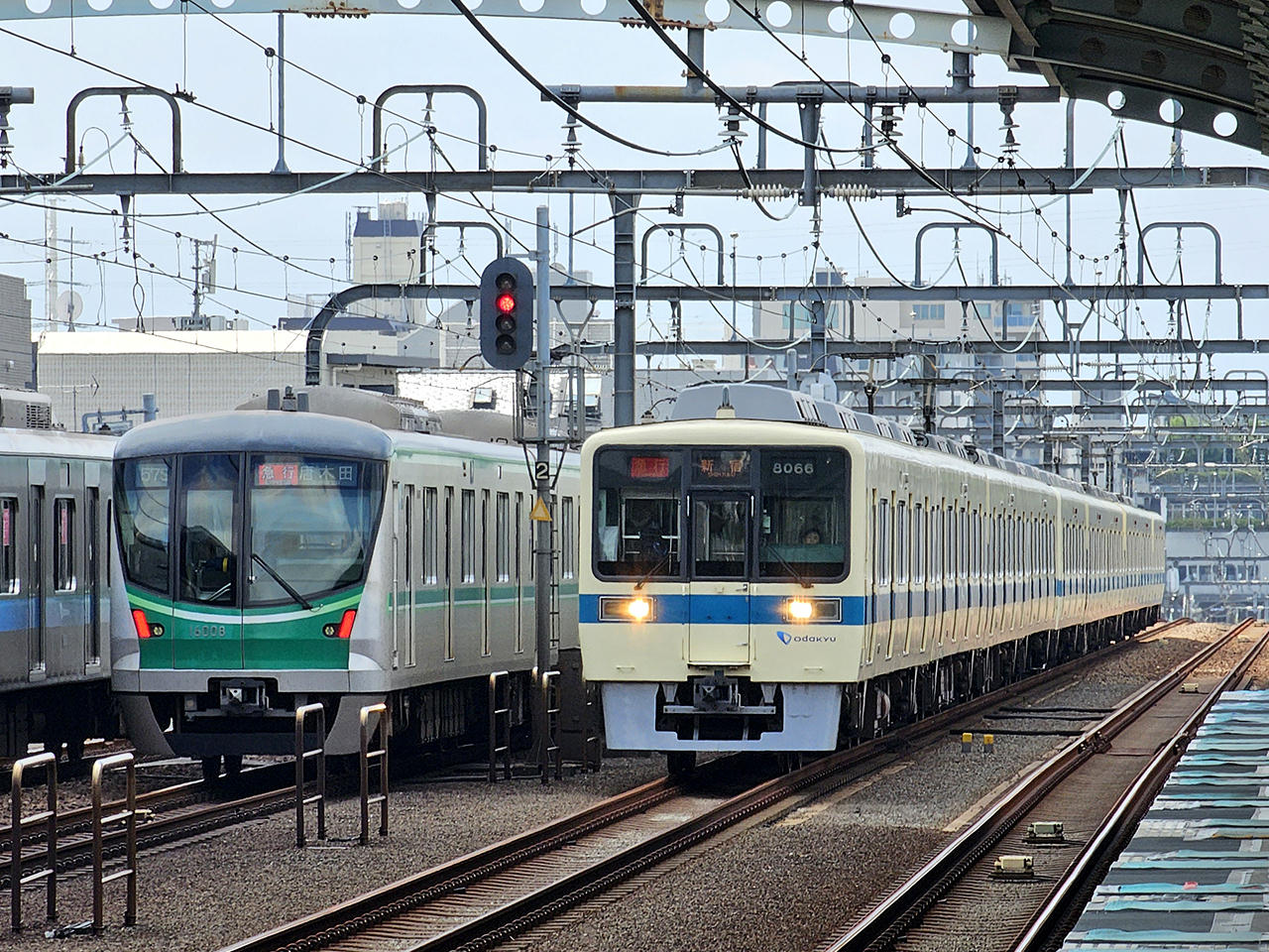 次世代を担う3社の地下鉄直通車両が並んだ。手前からメトロ16000系、JR東日本E233系2000番台、小田急4000形。 (代々木上原) |