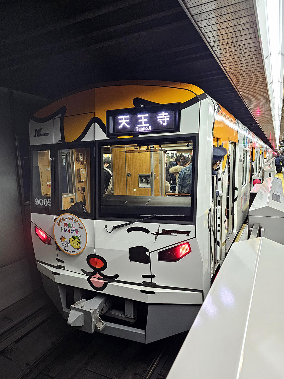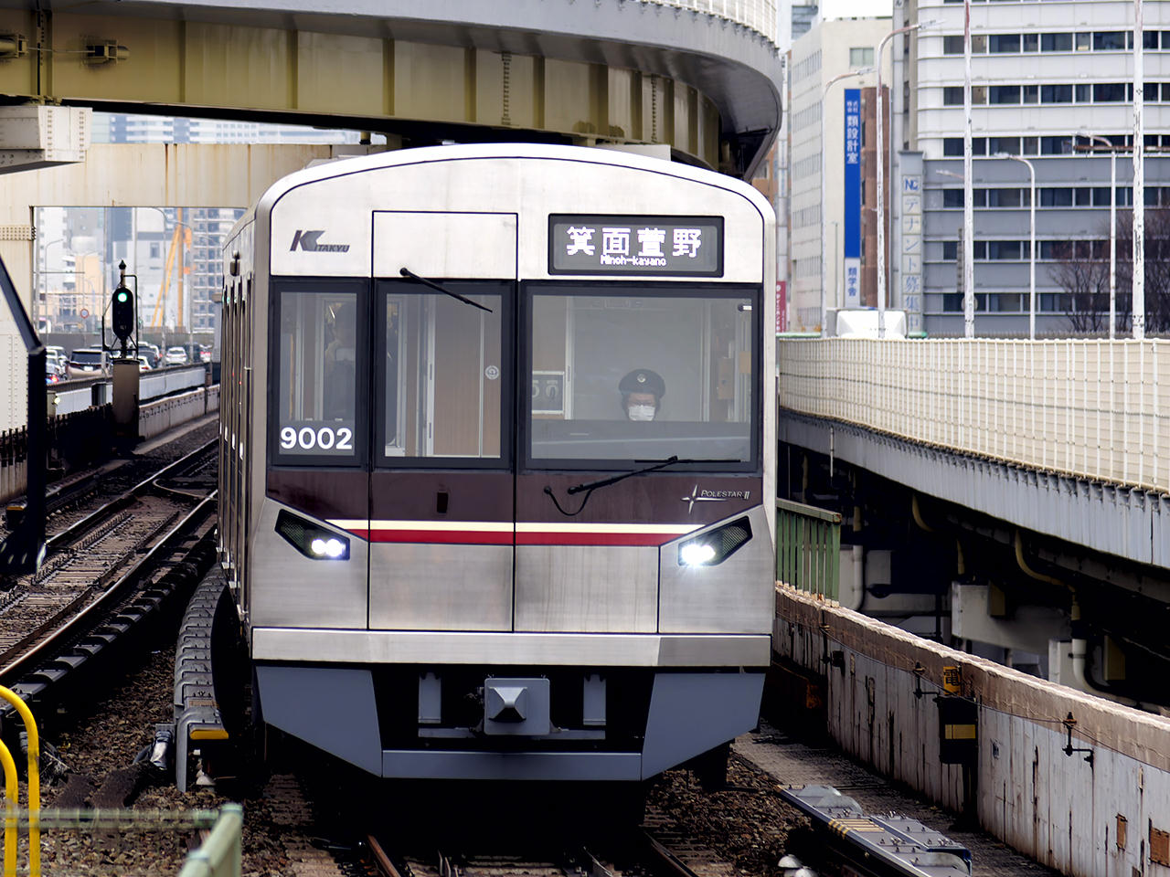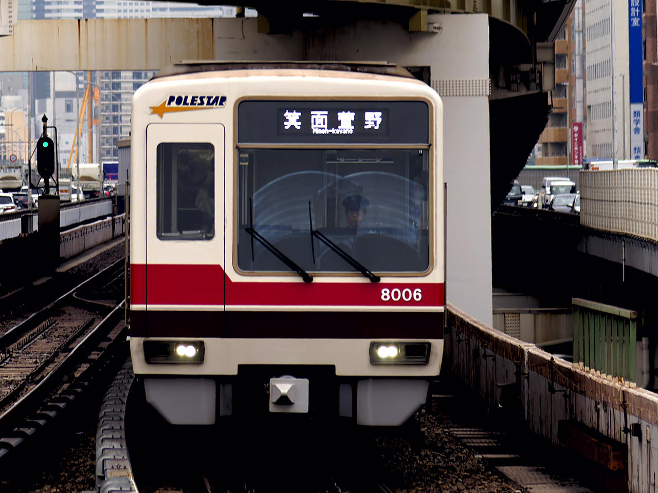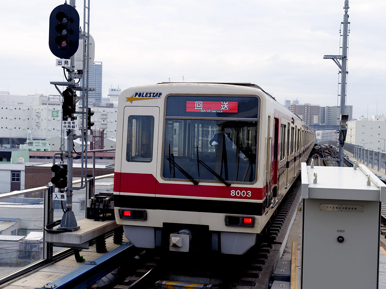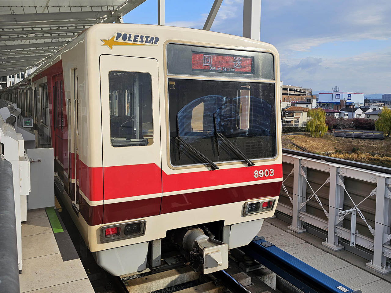 9001編成。真ん中が少し突き出す形になっている。また運転席側にも点検用?のカバーがあり、貫通扉と対称的になっているのが特徴。前照灯はLED。私が今回大阪にいる間は、夜間しか見かけなかった。8000系の機器更新による運用離脱や、かやの中央(仮称)までの延伸工事が始まるため、今後増備が予定されている。 (西中島南方) |
