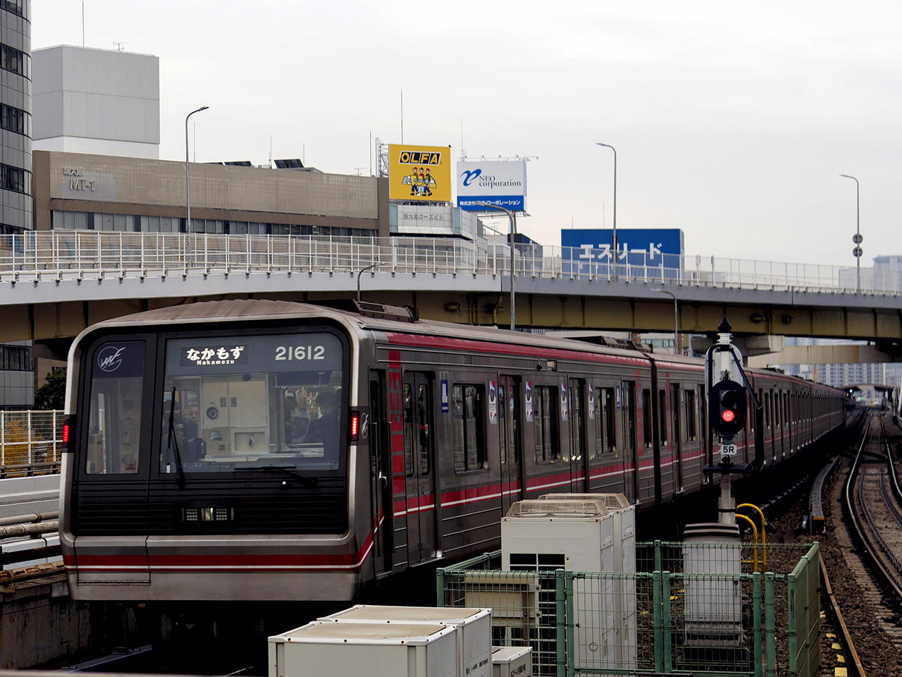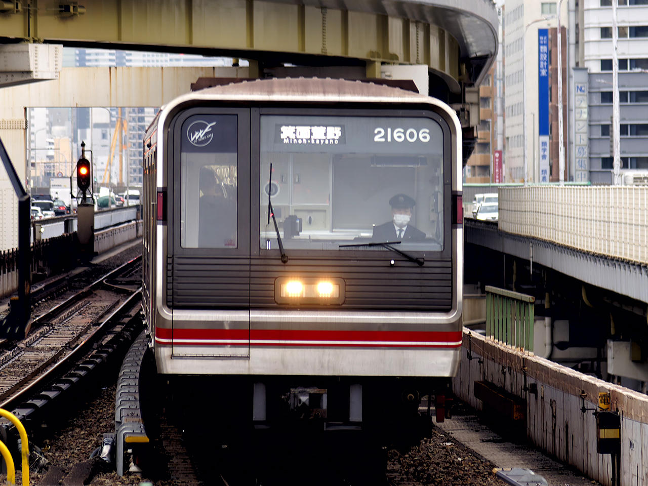 | 21系21601F21901。遮光幕が開いている。たまに江坂〜西中島南方で開いていることがある。なかもず方面が確率が高い。 (西中島南方) ★ 21601。西中島南方にて。こちら <リニューアル後> ★ 21601。更新された。江坂にて。江坂始発なかもず行が転線する。こちら |